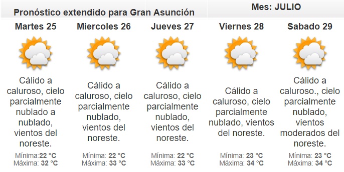 Desde la Dirección de Meteorología anuncian para este lunes un clima cálido a caluroso con vientos que rotan del noreste en gran parte del territorio nacional.