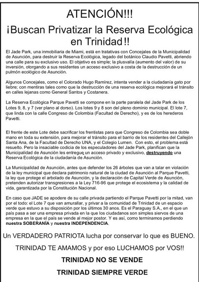 Según los defensores del Parque Pavetti, el Jade Park, viola varias normas ambientales, por tema de desagüe cloacal, la municipalidad no protege al Acuífero Guaraní que pasa por debajo del sitio y mucho más.