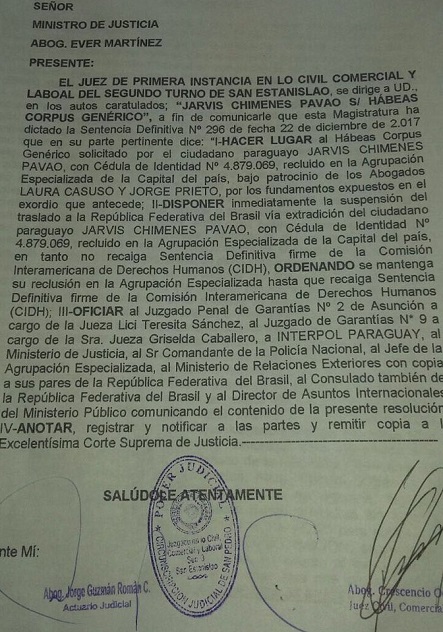 El documento judicial dispone la inmediata suspensión de la extradición del narcotraficante al Brasil, hasta que haya sentencia definitiva firme de la Comisión Interamericana de Derechos Humanos (CIDH). El mismo lleva la fecha del 22 de diciembre,