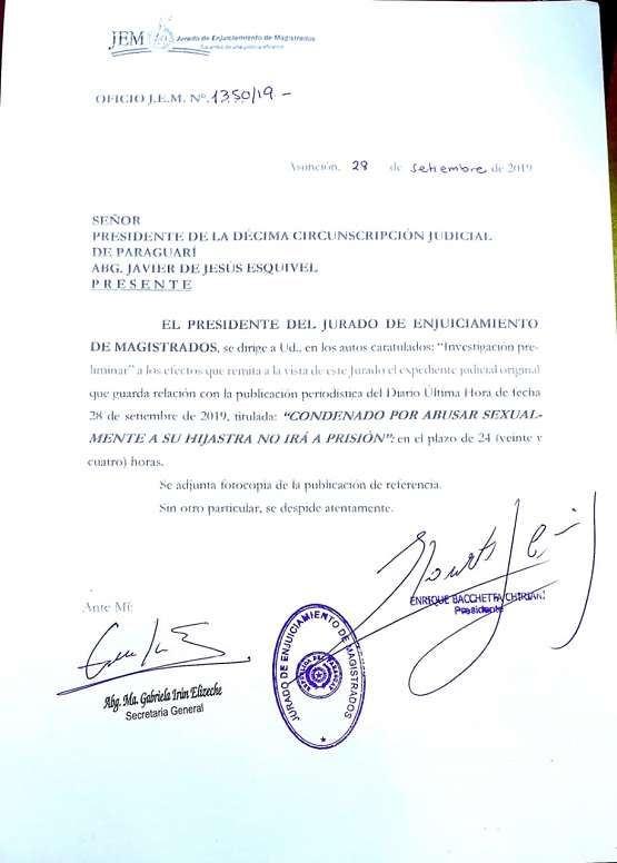 En tanto que a través de la página oficial de la institución manifestaron que el titular inició la indagación tras “la publicación del diario Última Hora, titulada ‘Condenado por abusar sexualmente a su hijastra no irá a prisión´, de fecha 28 de septiembre de 2019”.
