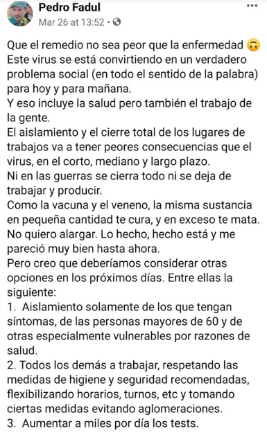 Según se puede ver en la impresión, el posteo se colgó el pasado jueves. En el mismo el hombre de negocios expresa lo siguiente: “Este virus se está convirtiendo en un verdadero problema social (en todo sentido de la palabra) para hoy para mañana”.
