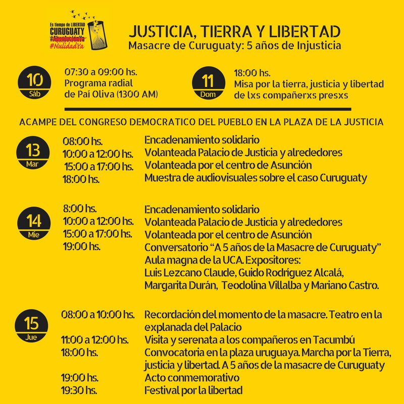 Luego de cinco años de la Masacre ocurrida en Curuguaty, activistas de diversos sectores sociales convocan a la ciudadanía a una serie de actividades conmemorativas. La misma se inicia con encadenamientos solidarios, volanteadas, muestras audiovisuales, conversatorios, entre otras actividades.