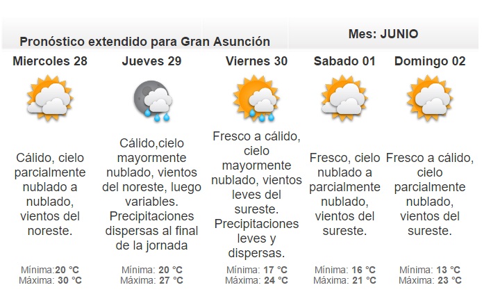 Según datos de la Dirección Nacional de Meteorología este martes el clima estará cálido con el cielo nublado a parcialmente nublado y vientos moderados del noreste.