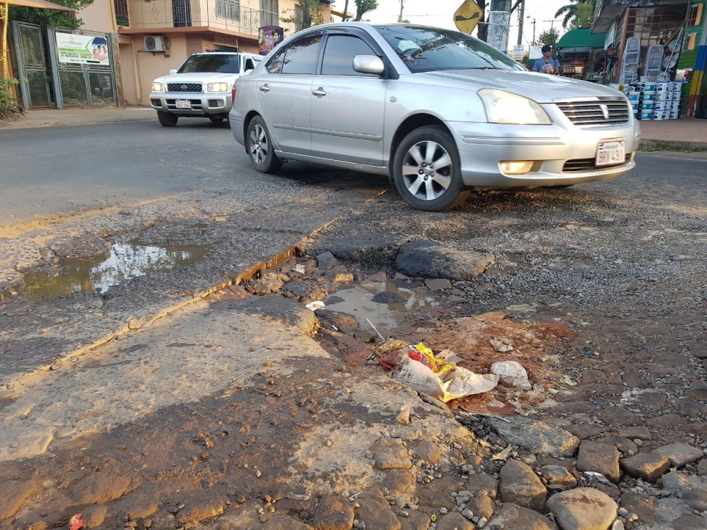 Otro de los puntos críticos se localiza, Sobre la avenida Mcal. López frente a la ciclovía donde los baches no perdonan a ningún vehículo.