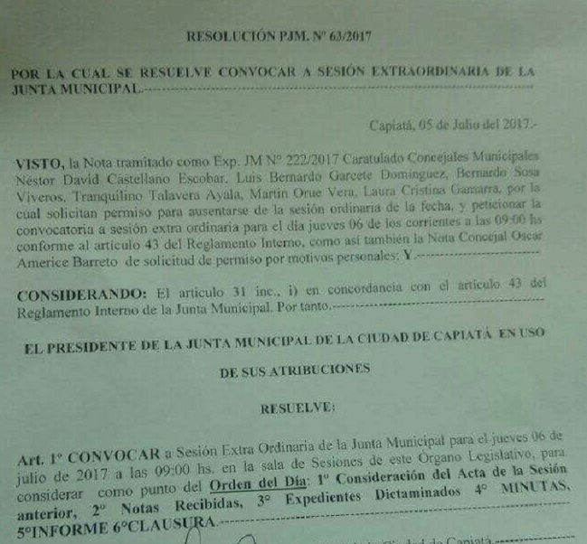 El presidente de la Junta Municipal, Javier Trinidad Salinas mediante una resolución otorgó permiso de abandonar la sesión a los concejales capiateños para ir hasta Mburuvicha Róga con el fin de saludar a Cartes.