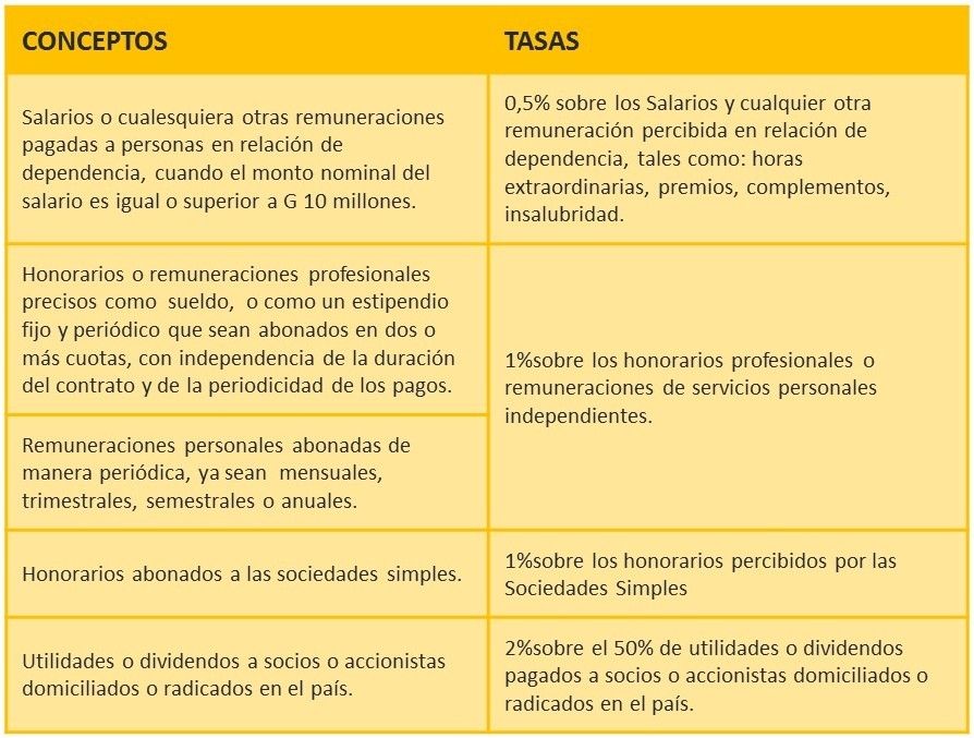 La normativa establece que las empresas públicas, las sociedades, cooperativas, asociaciones, las empresas unipersonales de la categoría de grandes y medianos contribuyentes, y las demás entidades públicas o privadas cualesquiera sea su naturaleza, deberán retener el IRP a los contribuyentes de este impuesto cuando paguen: