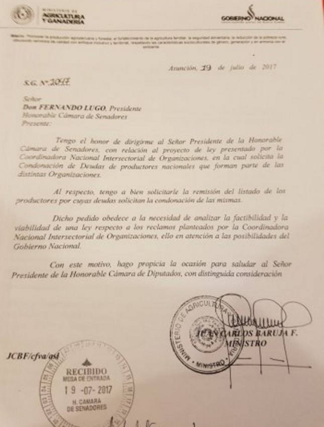 Mediante una nota dirigida al presidente del Senado, Fernando Lugo, el secretario de Estado solicita el listado de los campesinos que piden la condonación de sus deudas a fin de analizar la situación.