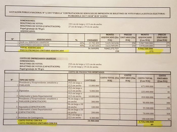 De acuerdo a fuentes del gremio de empresarios gráficos, los precios por la impresión de los boletines de voto puede ser incluso menor. Cumpliendo con los requerimientos solicitados por el TSJE, los precios de impresión incluso podrían rondar los G. 50 por cada boleta.