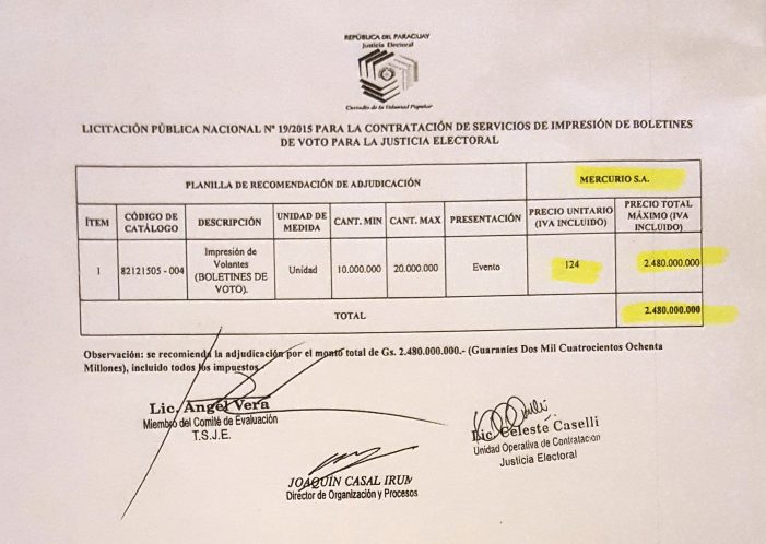 Para las elecciones de 2015, la empresa Mercurio SA resultó adjudicada para la impresión de 20 millones de papeletas. En esa oportunidad, cada boletín tuvo costaba 124 guaraníes y en total, el TSJE destinó G. 2.480 millones para este menester.