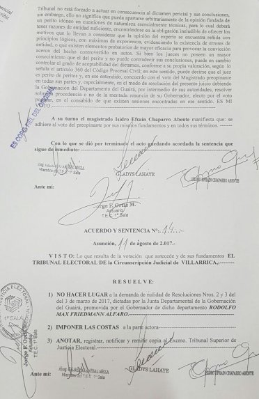 La demanda de nulidad de las resoluciones Nº 2 y 3 del pasado 3 de marzo dictadas por la Junta Departamental; la primera en donde se acepta la nota de supuesta renuncia de Rodolfo Friedmann y la segunda donde eligen a Chávez en su reemplazo no forjó para el Tribunal Superior de Justicia Electoral (TSJE).