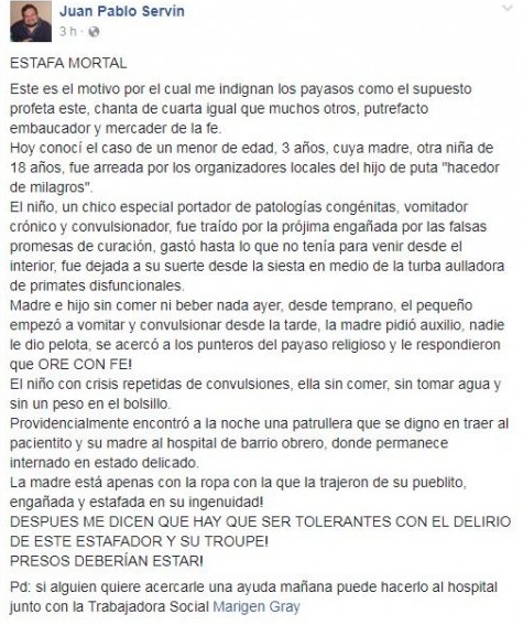 El Dr. Juan Pablo Servín publicó en su cuenta de Facebook las peripecias que paso la joven madre, la que habría sido engañada por las falsas promesas de curación por parte de “punteros del payaso religioso”, refiriéndose al religioso africano que realizó jornadas de sanación el viernes y el sábado en Asunción.