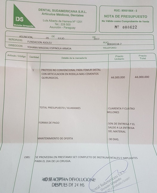 Para poder operarse necesita la suma de G. 44 millones que es el costo de la “prótesis no convencional para fémur distal con articulación en rodilla”, monto con el que no cuenta por ser de escasos recursos.