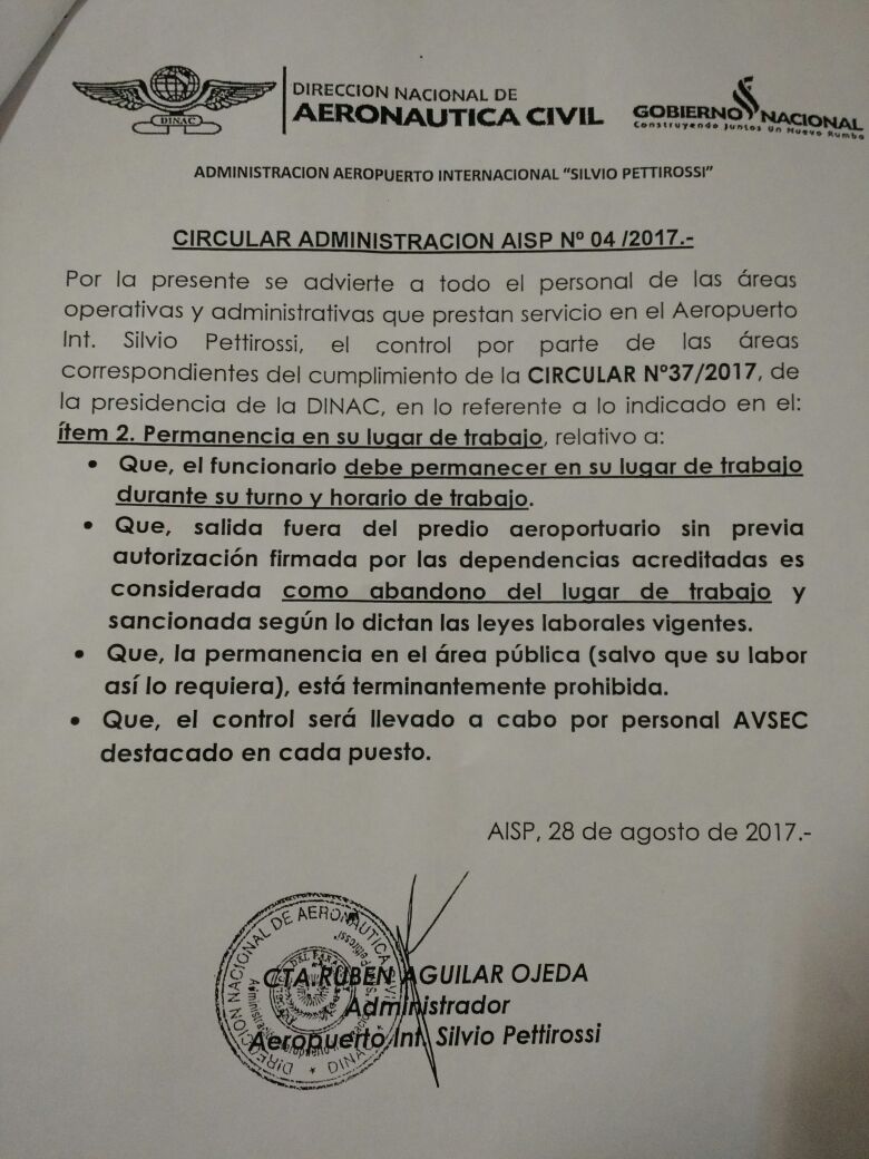 En la denuncia también se hace referencia a una presunta persecución, controlando la salida de los empleados al área pública del Aeropuerto Internacional Silvio Pettirossi.
