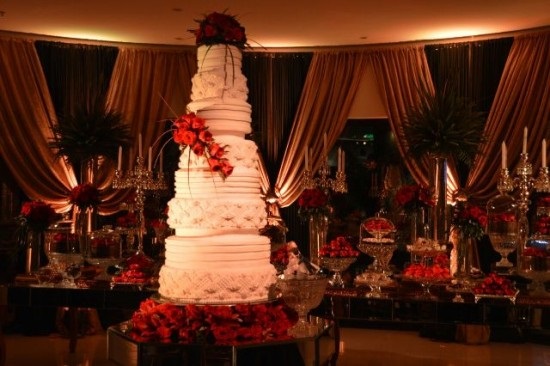 La torta estuvo decorada con unos simpáticos muñequitos montados en unos rollers, representando a los novios. El pastel fue elaborado por el chef Coco Leiva y el staff de La Oma. Coco aclaró que se inspiró en los deseos de la pareja y preparó un pastel sencillo pero decorado con tiernas rosas rococó. con el clásico capitoné, complementados con un osado bouquet de rosas rojas.