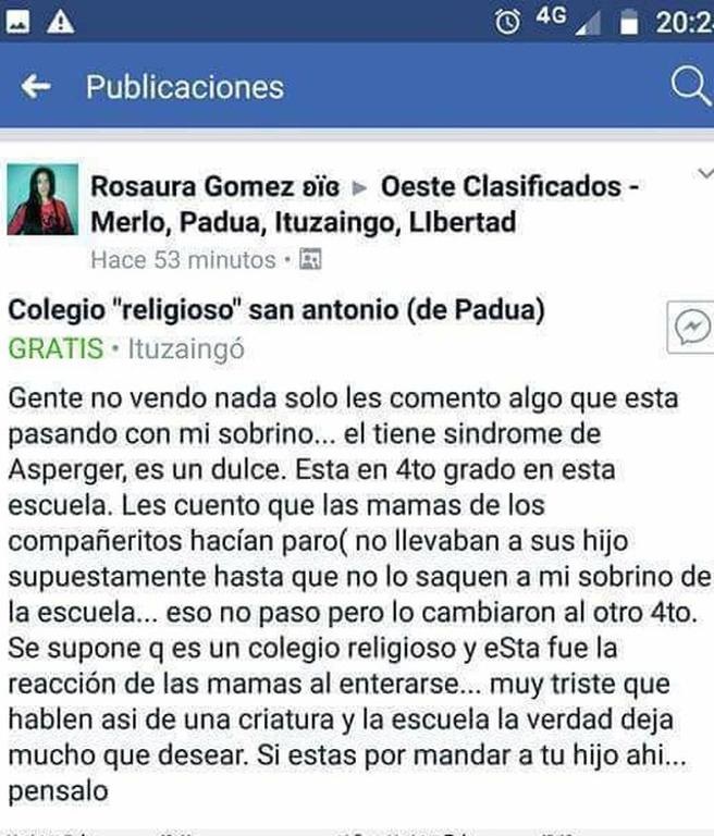 La conversación fue dada a conocer por una tía del menor en un grupo de Avisos Clasificados en Facebook con la siguiente introducción: “Gente, no vendo nada, sólo quiero comentarles lo que está pasando con mi sobrino. Él tiene Síndrome de Asperger, es un dulce. Les cuento que las mamás de sus compañeritos hacían paro (no llevaban a sus hijos) supuestamente hasta que no lo sacaran de la escuela. Eso no pasó, pero lo cambiaron a otro cuarto grado”, escribió.