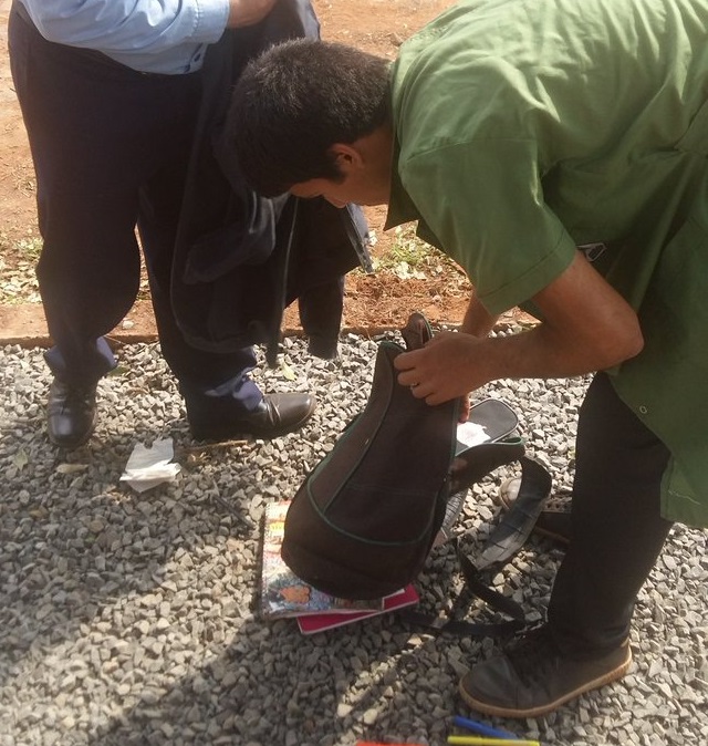 En tanto que un policía lo inspeccionó de pie a cabeza, removiendo entre sus posesiones, como por ejemplo, su mochila, su billetera, y otras pertenencias, como si fuera un delincuente.