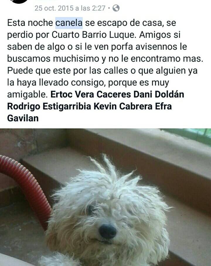 La usuaria de Facebook identificada como Nahiara Molinas denunció a través de su cuenta de la red social que encontró a su mascota, llamada Canela, casi dos años después de haberse perdido.