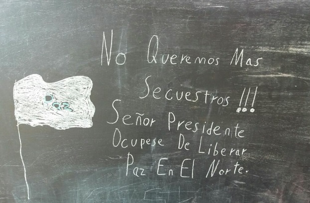Junto al texto estaba una bandera blanca, cuyo significado es la paz. El escrito fue difundido como parte de la campaña para liberar a los 5 secuestrados del norte del país.
