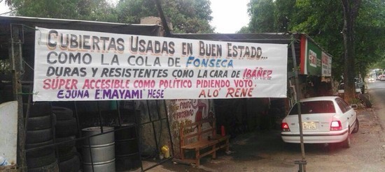 “Cubiertas usadas en buen estado como la cola de Fonseca”, fue lo que publicó el trabajador en un pasacalles colgado frente a su negocio, que está ubicado en la capital.