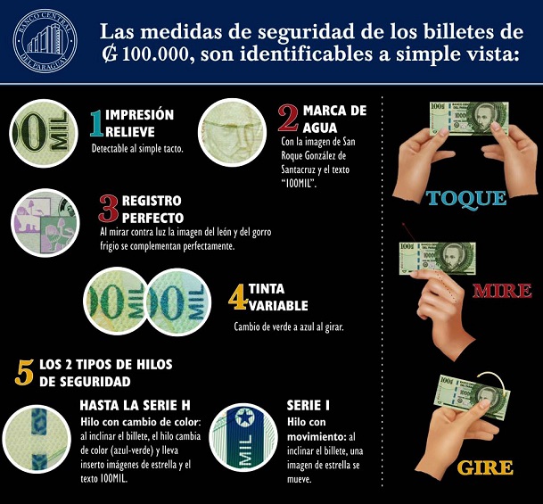 Luego de los rumores que corrieron a través de las redes sociales sobre la existencia de billetes falsos, el BCP recuerda a la ciudadanía en general las medidas de seguridad de los billetes de G. 100.000, las cuales, aseguran que son identificables “a simple vista”.