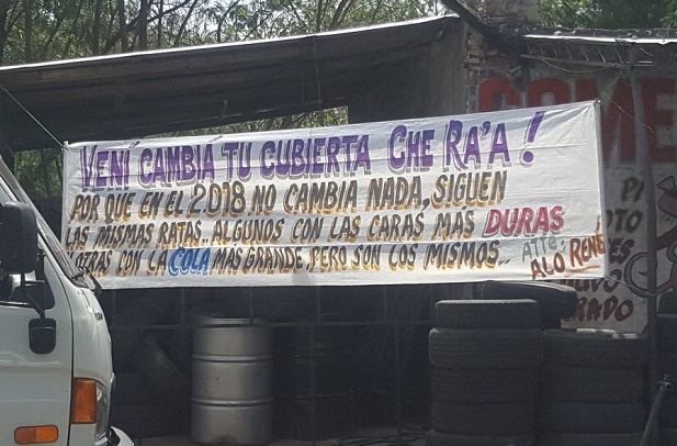 El pasacalle se encuentra frente a la gomería Aló René, en el cual aparecen escritos referentes a los candidatos de los diferentes partidos y movimientos quienes fueron inscriptos esta semana en el Tribunal Superior de Justicia Electoral (TSJE).
