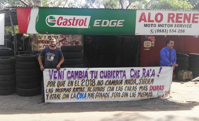 Alfonso Andrés Valdés, el gomero conocido por realizar pasacalles publicitarios con el fin de promocionar su gomería, apareció con nuevas frases, está vez en alusión a los precandidatos inscriptos para las elecciones 2018.