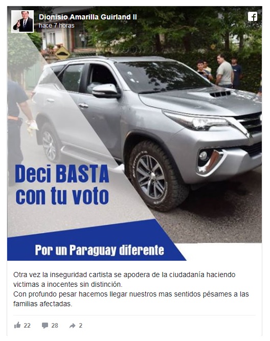 “Otra vez la inseguridad cartista se apodera de la ciudadanía haciendo victimas a inocentes sin distinción. Con profundo pesar hacemos llegar nuestros mas (sic) sentidos pésames a las familias afectadas”, señalaba la publicación.