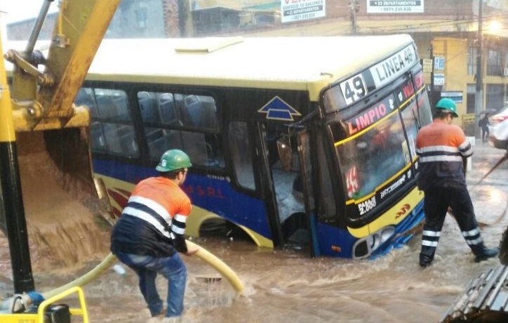 Un bus fue “tragado” por un pozo en la zona de obras del metrobús, en Fernando de la Mora. Los pasajeros tuvieron que salir por la ventanilla del conductor y un trabajador casi fue llevado por el raudal.