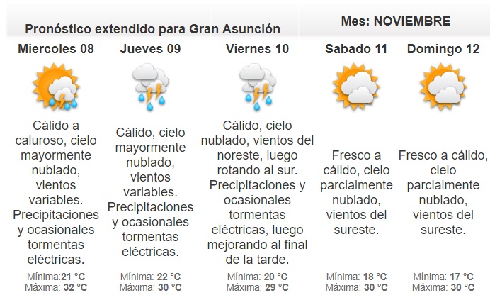 Las principales zonas serán: Concepción, San Pedro, Amambay, Canindeyú, centro y este de Presidente Hayes; desde el mediodía: Cordillera, sur de Presidente Hayes, Central, norte de Ñeembucú, Paraguarí, Guairá, y por la tarde, el norte de Caazapá y Caaguazú.