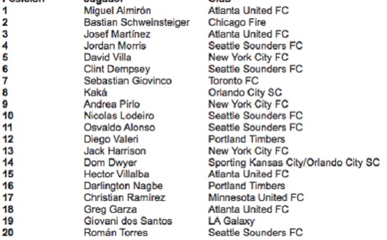 Con esto supera al alemán Bastian Schweinsteiger quien fue campeón del mundo en Brasil 2014, a su compañero de equipo el venezolano Josef Martínez, a la figura local Jordan Morris y al español David Villa, campeón del mundo en Sudáfrica 2010, en el top cinco.