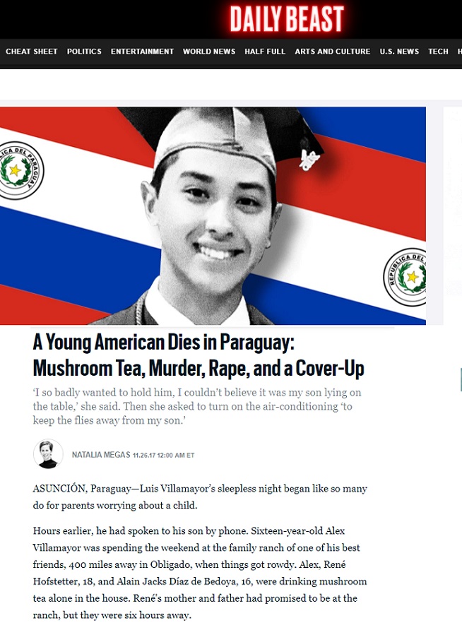 A las 8 de la mañana del día siguiente, el padre de Alex, Luis Villamayor, abogado y excongresista paraguayo, recibió una llamada de René que, llorando, le avisaba que su hijo estaba muerto tras dispararse a sí mismo.