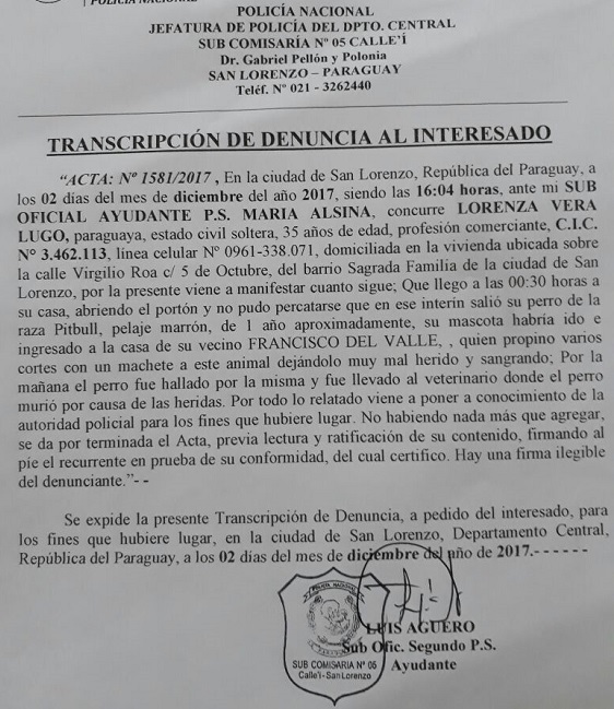 Lorenza Vera Lugo explicó a RDN que su mascota fue brutalmente asesinada por su vecino. El hombre no brindó explicaciones por lo acontecido.