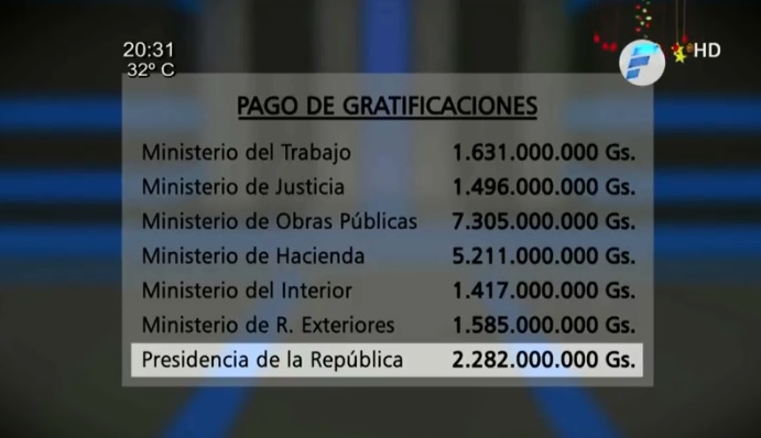 Por otra parte, se confirmaron también el pago de gratificaciones en el Ministerio de Educación y Ciencia pero sin precisarse el monto desembolsado al igual que en Petropar, INC y la ESSAP, según informe de Telefuturo.