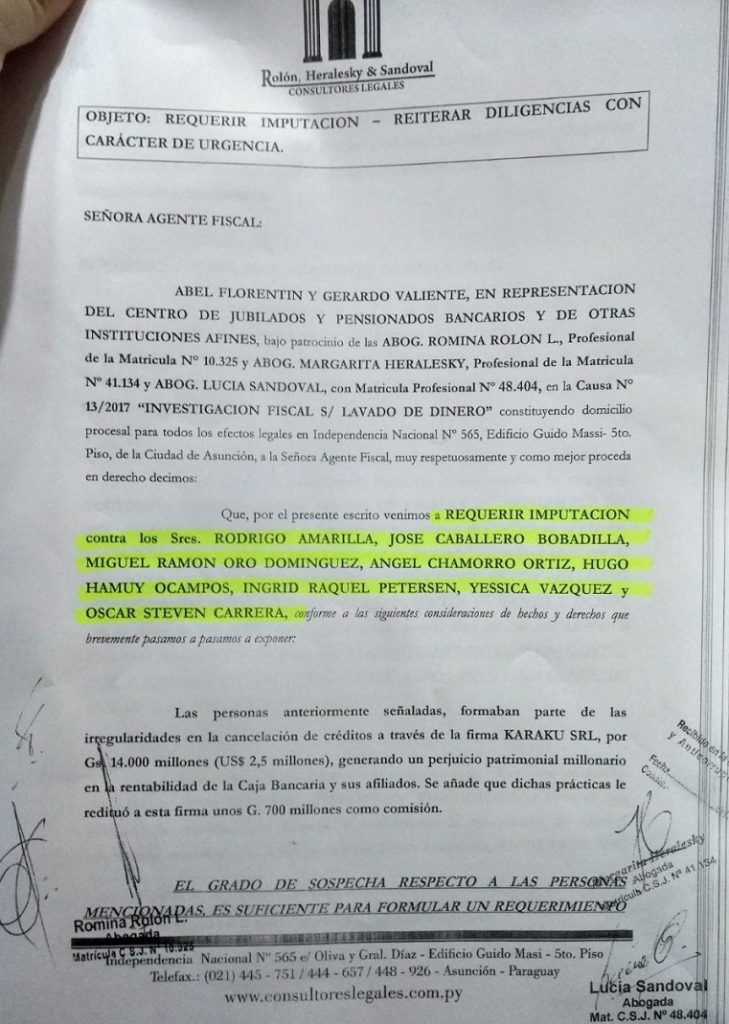 Según consta en la denuncia presentada ante la Fiscalía, se solicita la imputación de Rodrigo Amarilla, exgerente general de la Caja; además de José Caballero Bobadilla, presidente de la Caja; Miguel Ramón Oro Domínguez, del consejo de administración; Ángel Chamorro Ortiz, del Consejo Administrativo; Hugo Hamuy Ocampos, Ingrid Raquel Petersen, Yessica Vázquez y Oscar Steven Carrera, por lo mencionado anteriormente.