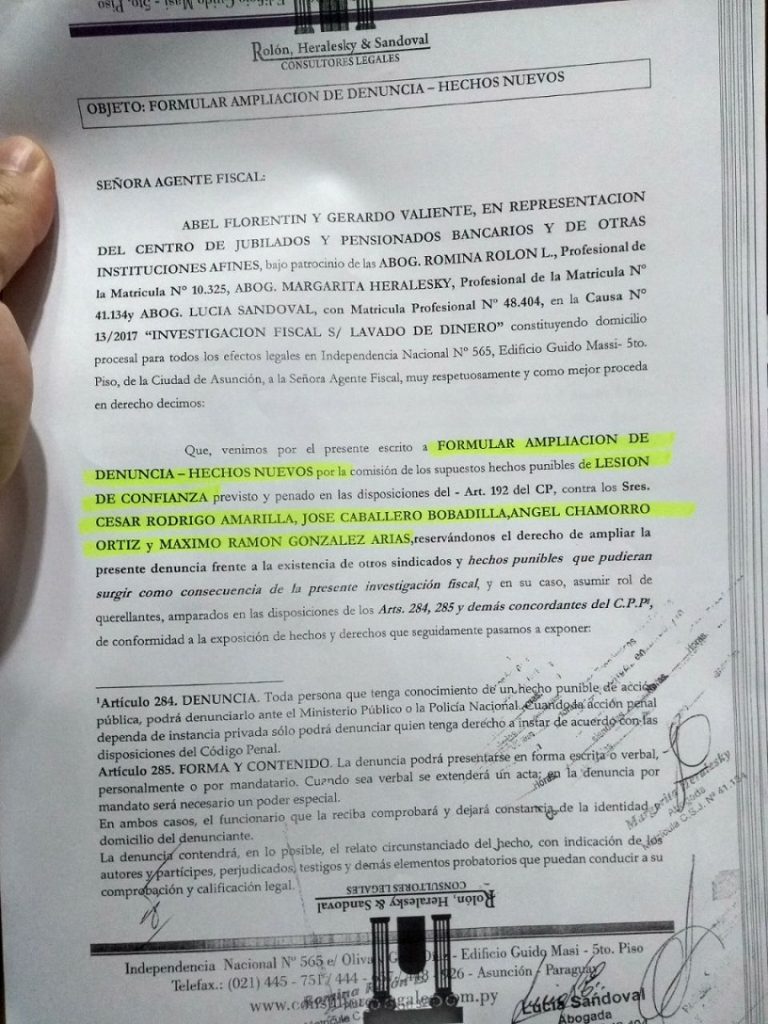 Abel Florentín y Gerardo Valiente, en representación del Centro de Jubilados y Pensionados Bancarios y de otras Instituciones Afines, presentaron una denuncia formal y una ampliación de la misma ante la Fiscalía de Delitos Económicos y Financieros.