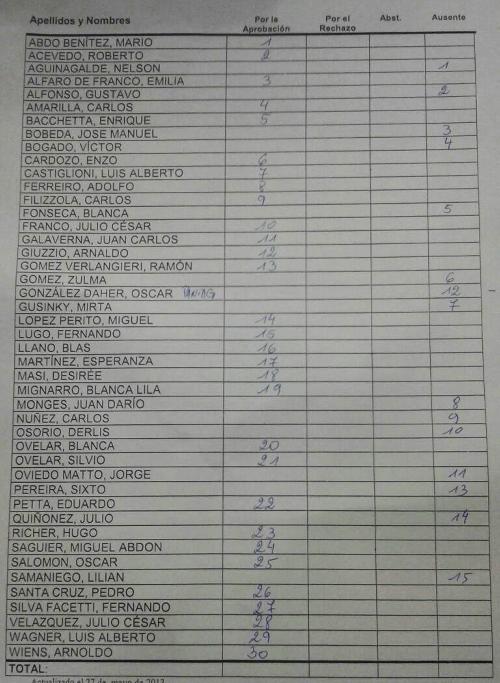 #AHORA Con 30 votos, en votación nominal, se Aprueba la perdida de investidura del Senador Oscar Gonzalez Daher #SenadoPy #SesionExtraorinaria pic.twitter.com/vgpiWJHMt6