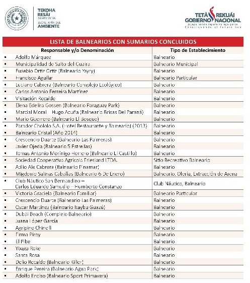 Los 32 balnearios sancionados corresponden a los departamentos de Central, Cordillera, Paraguarí, Guairá, San Pedro, Caaguazú, Alto Paraná, Amambay y Canindeyú.