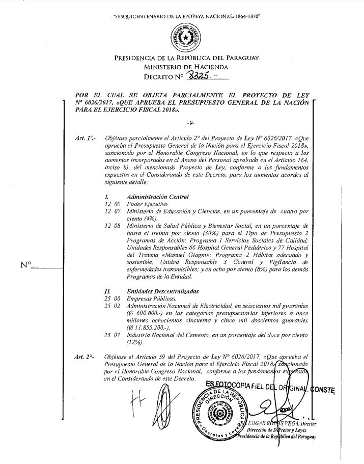 El presidente @Horacio_Cartes firmó el decreto Nº 8325 que veta parcialmente el Proyecto de Ley N° 6026/2017, «Que aprueba el Presupuesto General de la Nación para el Ejercicio Fiscal 2018» pic.twitter.com/N9CoGz41bX