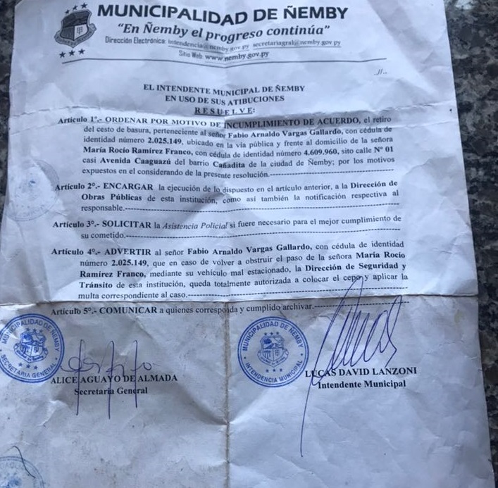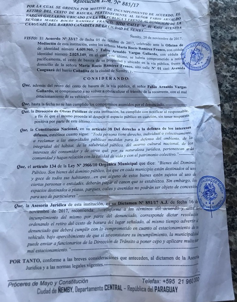 El pasado 20 de noviembre obtuvo una resolución favorable para el retiro del basurero, que se encuentra ubicado frente a su vivienda, sin embargo el encargado de hacer efectiva la orden no lleva adelante el procedimiento.