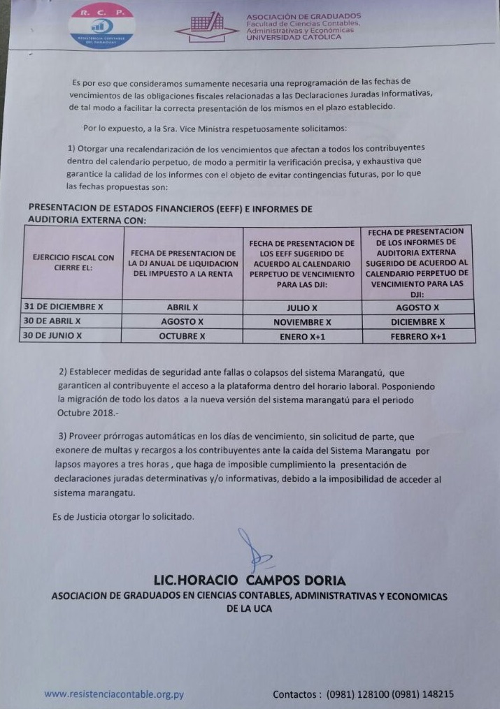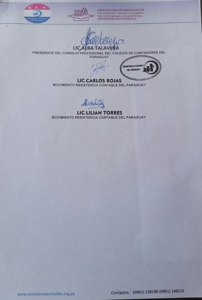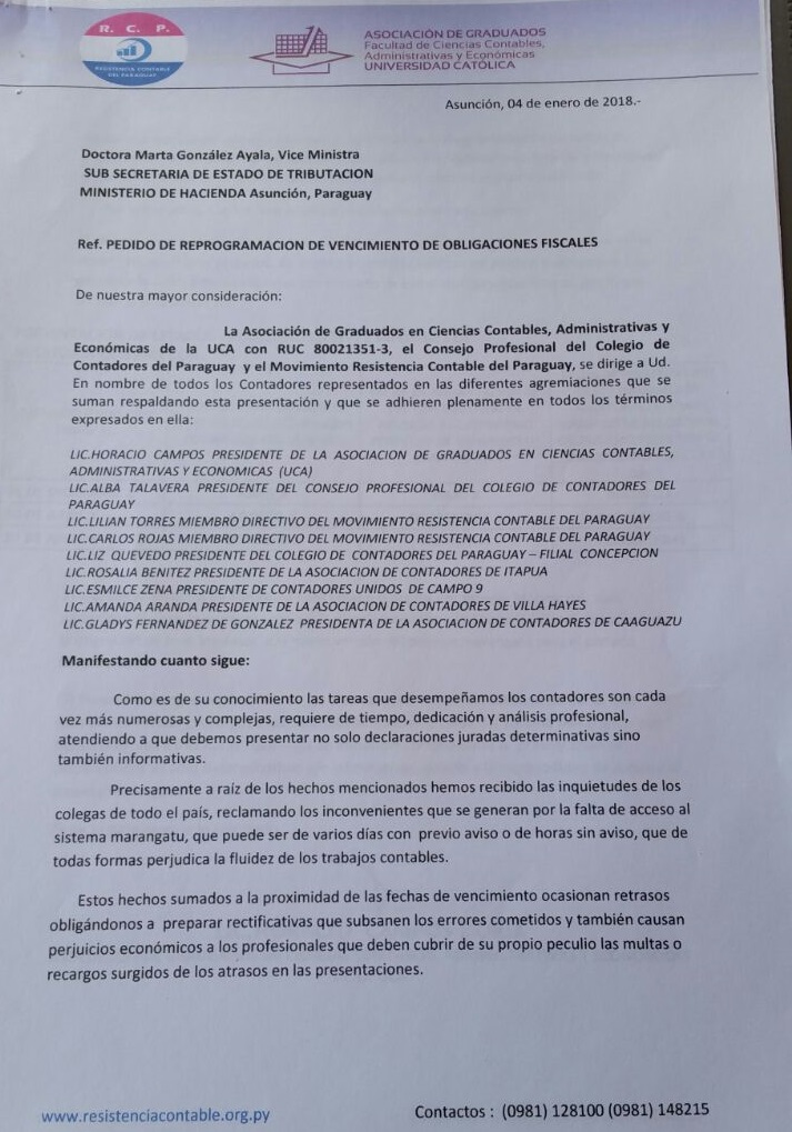 La Asociación de Graduados en Ciencias Contables, Administrativas y Económicas de la UCA, el Consejo Profesional del Consejo de Contadores del Paraguay y el Movimiento Resistencia Contable del Paraguay, son los grupos de profesionales que remitieron la nota a la autoridad de la SET, Marta González.