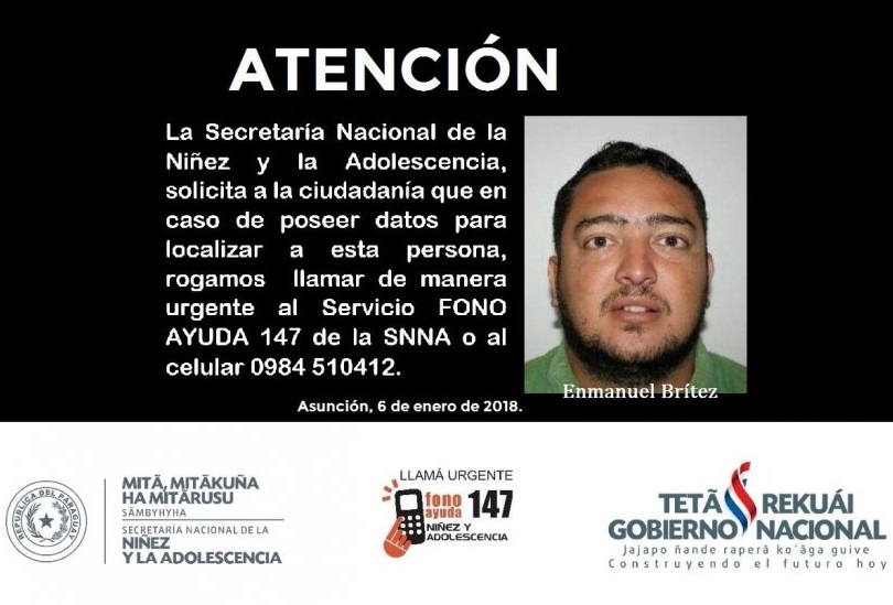 Solicitan a las personas que tengan datos sobre el hombre, llamen inmediatamente al servicio de Fono Ayuda, 147 de la SNNA, o al celular (0984) 510412.