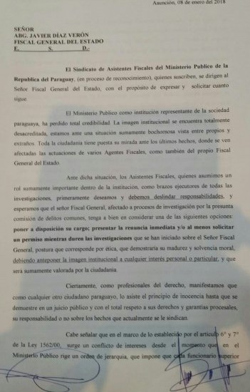 El pedido del sindicato es que la Contraloría General del Estado realice una auditoria en la Fiscalía, que abarque desde el inicio del mandato de Díaz Verón hasta la fecha.