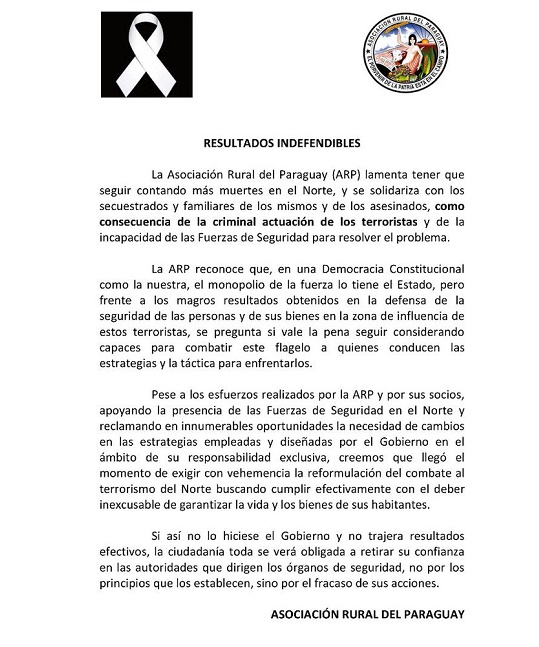 El escrito indica además que lamentan tener que seguir contando más muertes en el Norte y el gremio se solidariza con los secuestrados y familiares de los mismos, y de los asesinados, “como consecuencia de la criminal actuación de los terroristas y de la incapacidad de las fuerzas de seguridad para resolver el problema”.