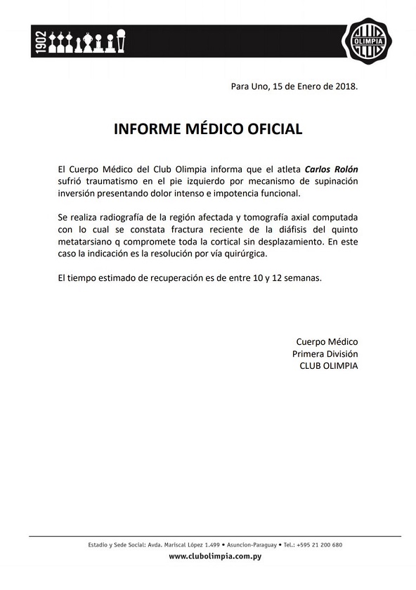 Eo defensor Carlos Rolon sufrió la rotura del quinto metatarsiano del pie izquierdo y será intervenido hoy a las 14 hs, tendrá una inactividad de diez semanas. @ABCCardinal