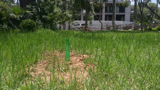 Una botella de gaseosa vacía es la única marca que indica el rincón de la Plaza de Armas del Congreso que se convirtió en un sepulcro improvisado. La botella verde apenas se distingue en medio del pasto y es probable que en algún momento se arrastrada entre las basuras y el sitio quede condenado al olvido. El sarcófago, un táper.