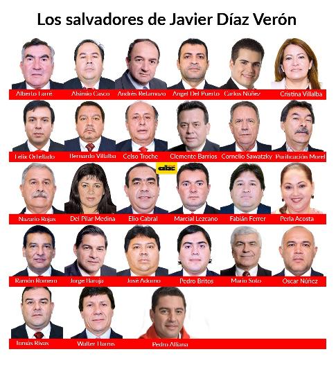 -Ausentes: Mirta Ramona Mendoza (PLRA), Cynthia Tarragó (ANR), Fabiola Oviedo (ANR), Carlos Maggi (ANR), Antonio Gustavo Cardozo (PLRA), Blanca Vargas de Caballero (ANR), Dionisio Amarilla (PLRA), Héctor Lesme Delgado (PLRA), María Carísimo Sosa (PLRA), Miguel Tadeo Rojas (ANR).