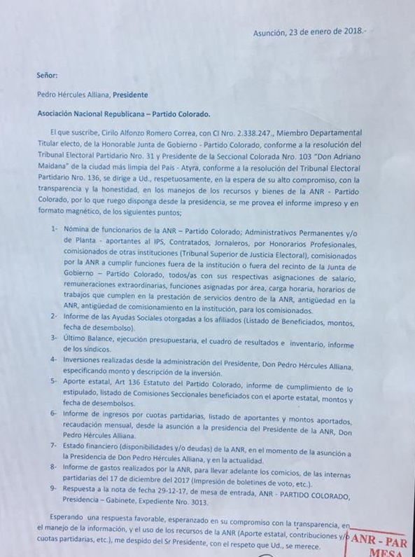Cirilo Alfonzo Romero Correa, miembro departamental de la Junta de Gobierno, y presidente de la seccional colorada Nº103 “Don Adriano Maidana” de la ciudad de Atyrá solicitó vía nota al presidente de la ANR, Pedro Alliana un informe del uso de los recursos.