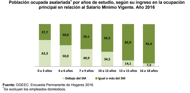 Mientras que el 6 de cada 10 trabajadores que solo estudiaron entre 0 a 3 años ganan menos que el sueldo mínimo, según los datos de DGEEC.