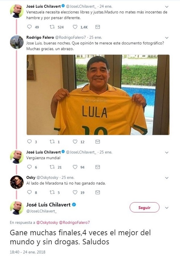 Anteriormente, había catalogado como “vergüenza mundial”, una imagen de Maradona sosteniendo una camiseta con la inscripción Lula, en referencia al ahora condenado a prisión Lula da Silva, expresidente del Brasil.