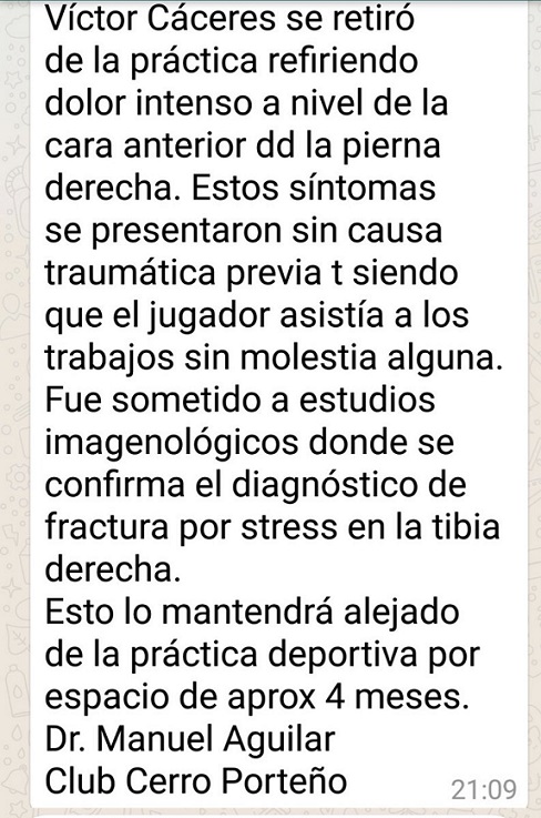 El diagnóstico confirmado por parte del médico del club, Manuel Aguilar, señala fractura por stress de la tibia de la pierna derecha.